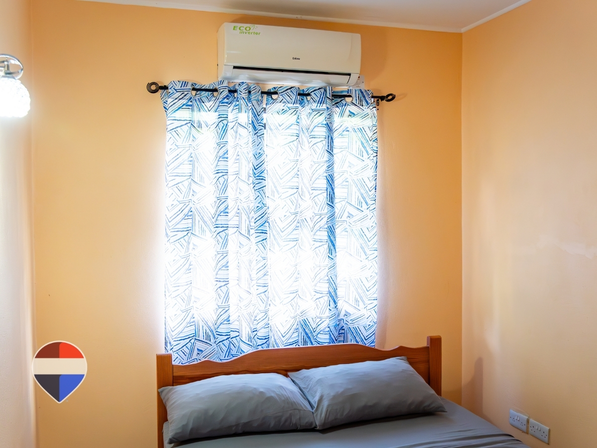 The apartment features a bright and contemporary layout with two spacious bedrooms, each equipped with its own air conditioning unit to ensure cool and restful nights. The kitchen and living areas are thoughtfully designed for both comfort and functionality, creating a welcoming space to relax or entertain.